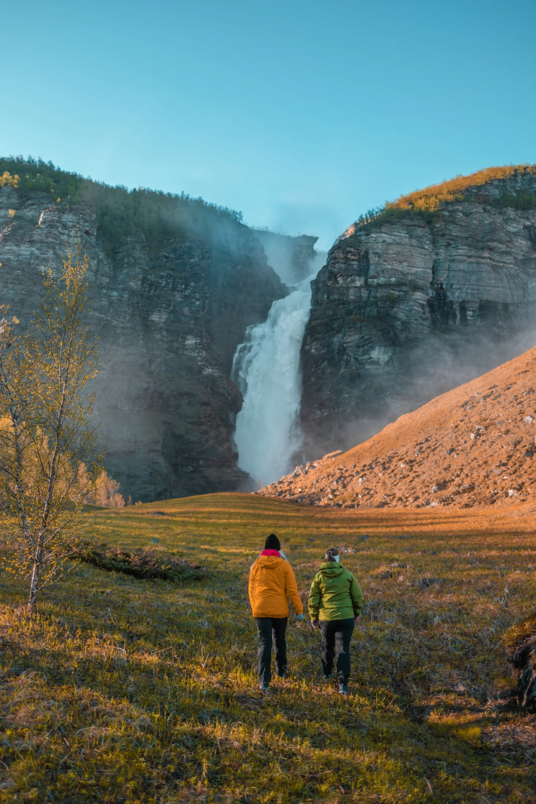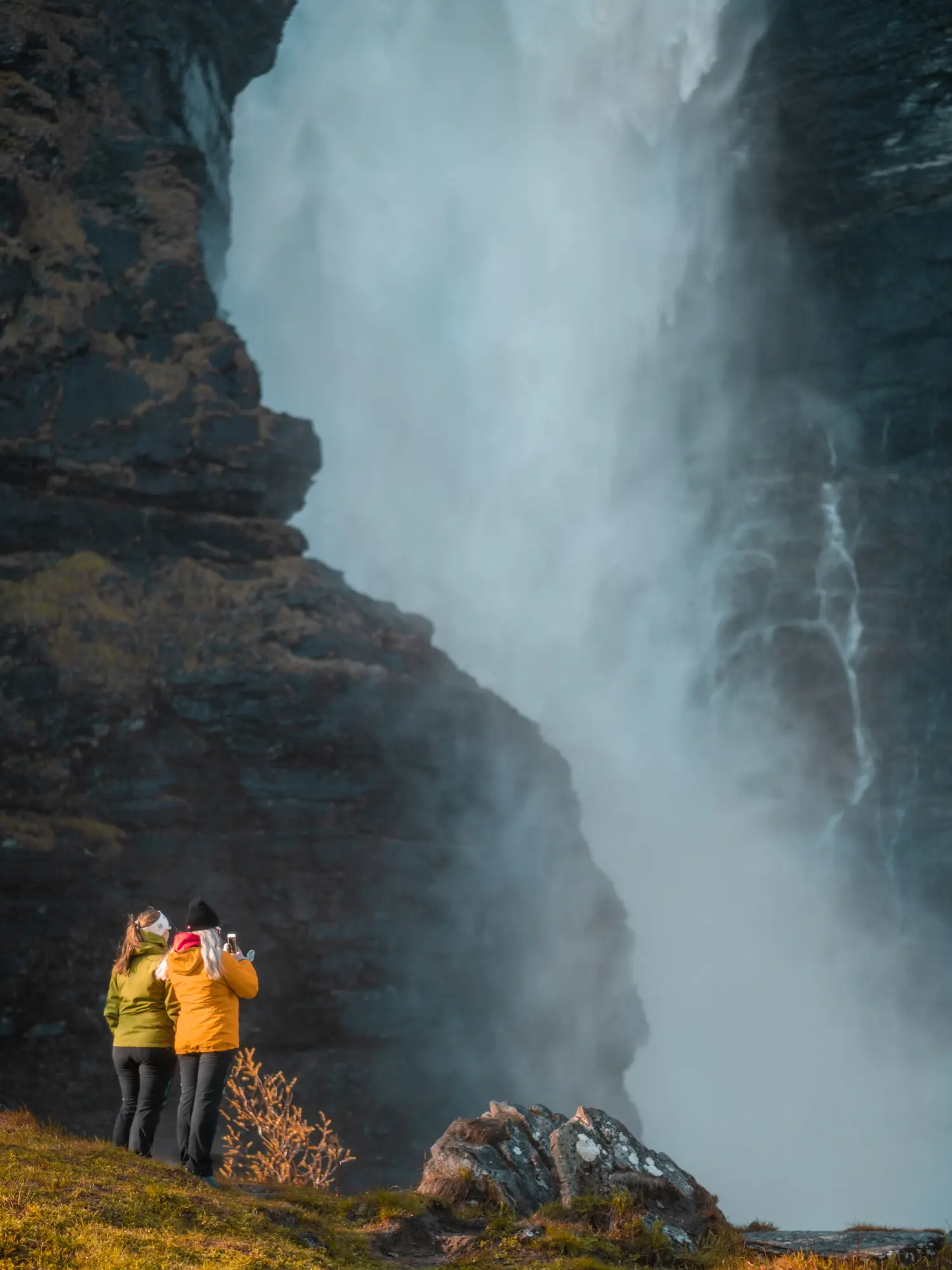 After about 20 km, we arrive at Mollisfossen — one of the tallest waterfalls in Northern Norway. We take time to walk closer, enjoy the view and take photos.
